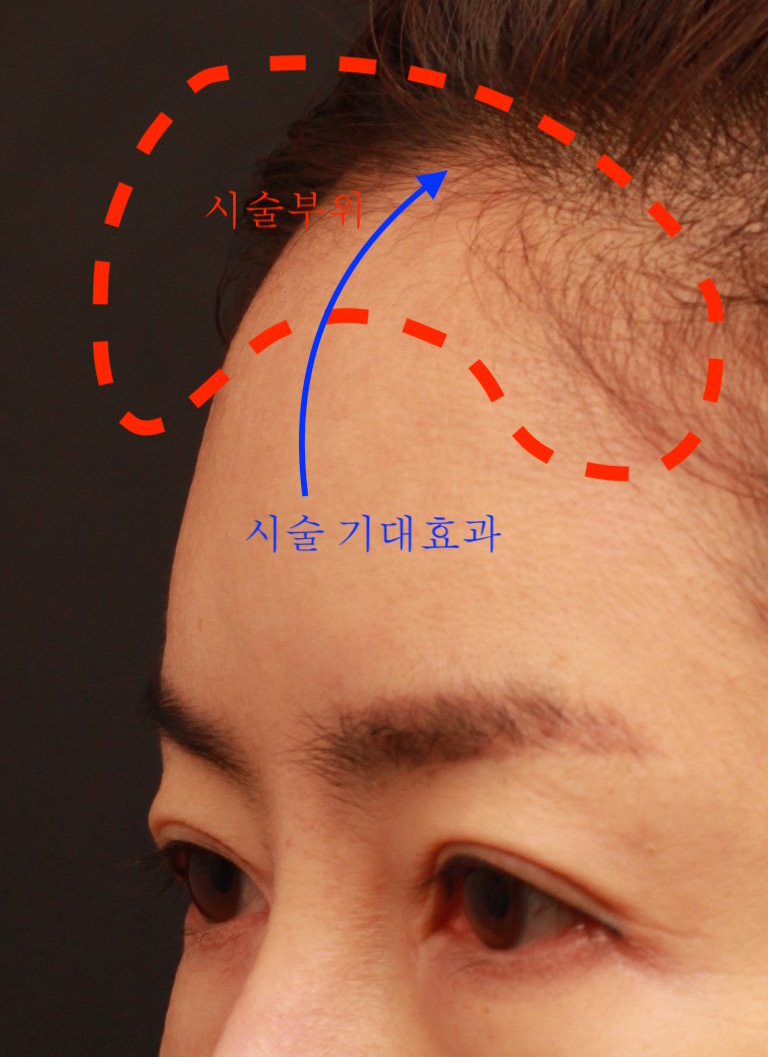 내시경을 이용한 이마당김술은 이마의 헤어라인 부근에서 3~4개의 수직절개를 통해 이마피부, 근육, 피하지방조직 등을 당겨주고, 여기에서 관자놀이 부근에 수평절개를 해서 이마의 바깥쪽 부분 즉 눈썹 끝자락 부위를 당겨주는 수술법입니다.